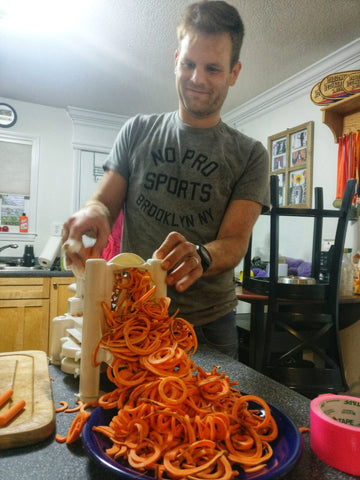 Add your favorite sauce (we like to make pesto) and veggies (we like sauteed kale and broccoli) on the side. Super easy, sweet potato noodles steam cook in 6 minutes.