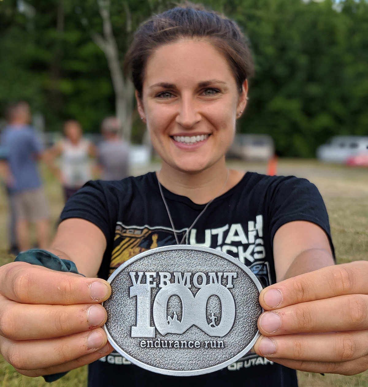 Heading into the night for our last romp, Robert informed us that the 4th place woman was 7 minutes ahead. I turned and laughed, as if I had any chance of catching her. The finish line drew me in, filling the adrenaline tank. I was actually going to finish this thing. And in the top 5! I began to write the story before the story was over. With 1.5 miles to go, two headlamps bobbed ahead at the top of a hill. “I think that’s her,” Lydia mused. “Let’s get her.” As we power hiked past the walkers, two lights turned slowly not to meet our eyes, but to directly illuminate our bibs. Four eyes widened as the 4th place woman and her pacer realized we were running the 100 miler and not the 100k. Go time. Lydia and I made the final turn into the woods and picked up the pace. A fever of excitement took over, as this 100 mile journey became a 1 mile race to the red neon I dreamt of for a year. We spent 9 exhilarating minutes ‘whooping’ and ‘yipping’ at how much fun this was! We both couldn’t believe the night we were having, how goddamn lucky we were to get to do this. The final mile of the VT100 was my fastest of all 100. I put 8 minutes on the next woman, though the place didn’t really matter at all. Those sweaty and heartfelt hugs from Lydia, Robert, Mom and Dad will always carry more weight than a belt buckle on the podium.